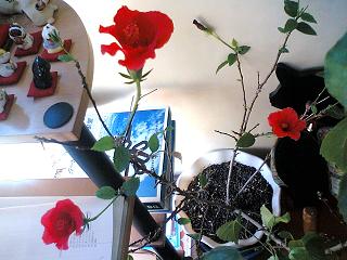 見送りの前に、ふと仕事場の隅を見たら、此の寒いのにハイビスカスが三輪咲いていました。