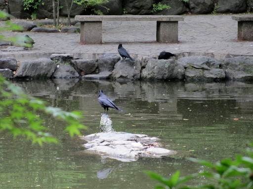 亀の頭みたいに見える石の上で得意げにしていたカラスも「わぁ~っ!亀がこっちにやってきた!」と池の淵まで駆けてきた子供たちの勢いに吃驚して逃げ出した。