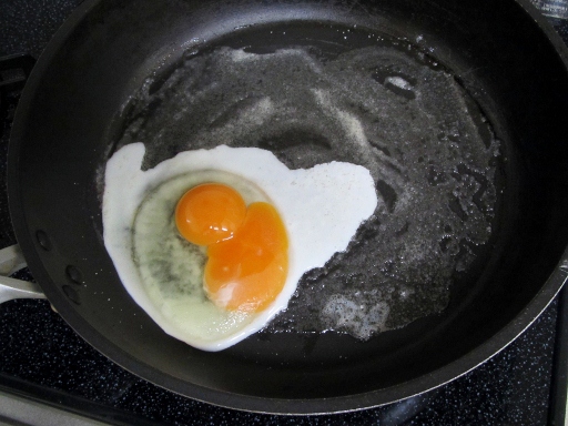 目玉焼きを作ろうと卵を割ったら、黄身が二つ入っていた。
