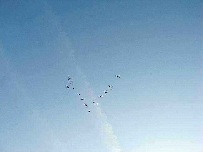 デジカメを向けたら、一気に隊列が崩れたので撮るのを諦めてそのまま行き過ぎ、ふと、もう一度鳥たちに目を向ければ、再びV字型を直そうとしていた。