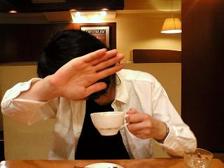 と云うことで、御茶を飲んでいる時に不意打ちを見舞って携帯でお写真を撮ろうとしたら、思い切り顔を隠されてしまいました。