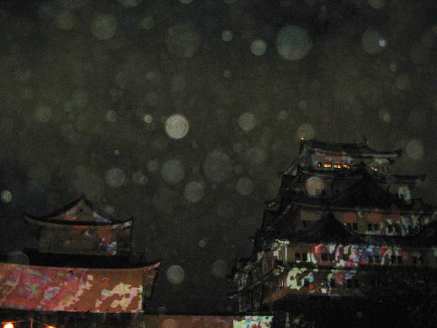 ↑ ライトアップの関係で、空中に何かの微粒子でも舞っているのかと思い、かなり離れた場所からライトアップされた天守閣の遠景(二つ上の写真が実はそれ)を撮ってみたけれど、結果は同じだったので正面に戻って何度も挑戦してみたが・・・駄目だぁ。