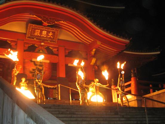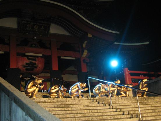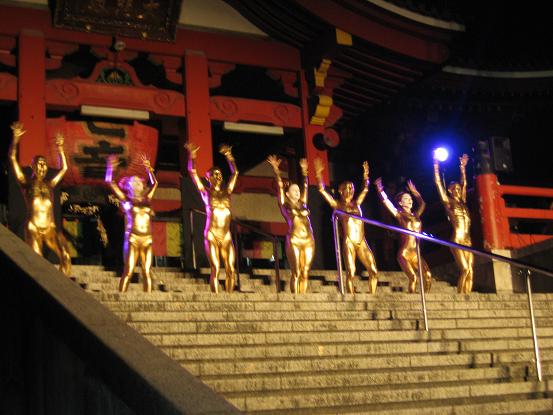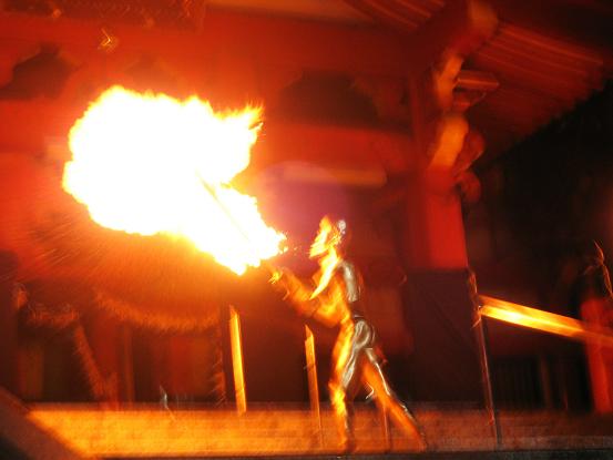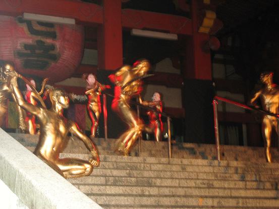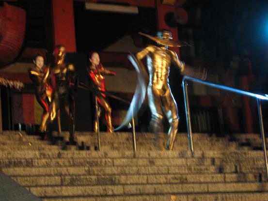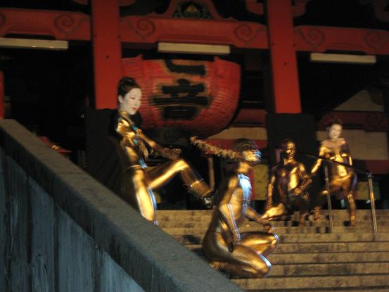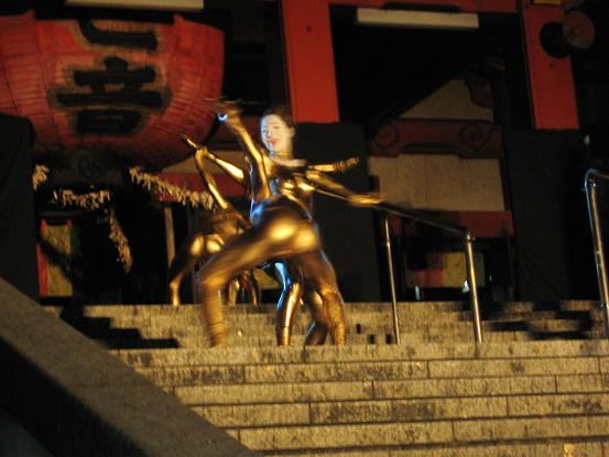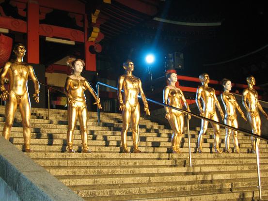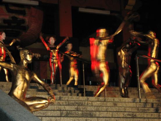 境内での公演、なんだか幻想的な感じで良いですね。金粉ショーが大道芸の中で一番目玉なのかしら。それにしても女の人だけ顔が金じゃないのがいつも変な感じがします。裸目当ての人向けなのかなあ。