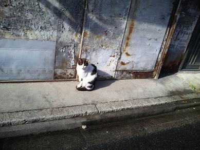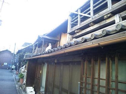 猫の後ろにある祠は、一本奥の路地周辺に住んでいる人たちが世話をしていた屋根神様。