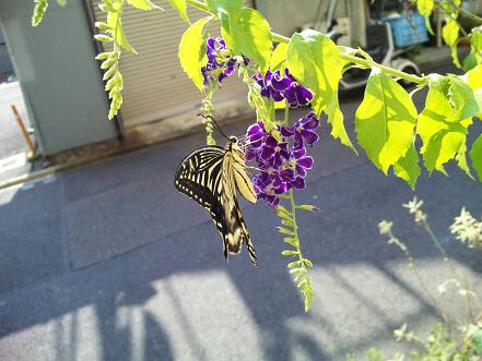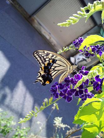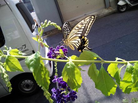 それでも数日前から、朝になると一匹のアゲハチョウが例年より少ない花の蜜を求めて、家の前にやってきます。